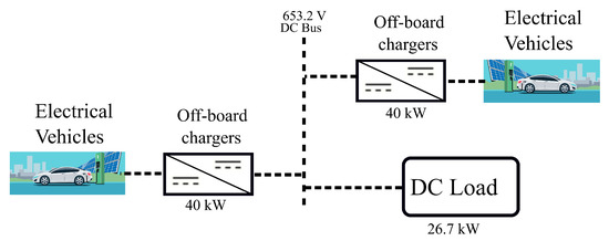 The off-board chargers are the EVs on-site and fixed charging stations. Those are the chargers that are not embedded in the vehicle construction [33]. From the Figure 1 and Figure 2, the off-board chargers are the converters that link the EVs to the DC bus. The battery charging configuration consists of a bi-directional converter configuration that operates by following the direction of the power flow. It works as a buck when the power flows from the DC link to the EV’s battery, i.e., charging mode or G2V. On the other hand, it works as a booster, when the power flows from the EVs battery to the DC link (on-ward to the grid), i.e., discharging mode of V2G.