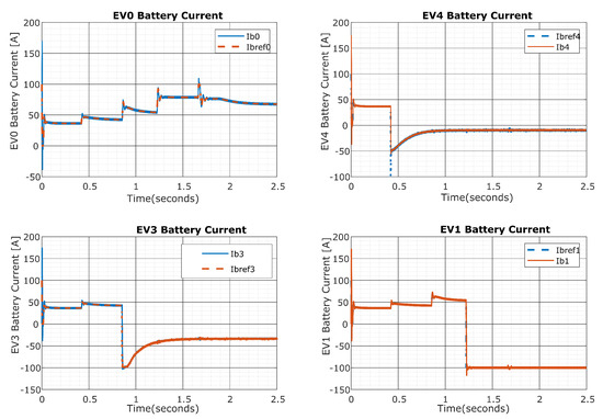 Hence, the power flow direction at the point of common coupling is negative at the beginning; it continues to be negative, as the EVs gradually switch back to charging mode following the sequence shown in Table 2. After that, all of the EVs switched to charging, except EV0, which does not change the state; the power demand from the grid is higher than that injected. Therefore, the grid power becomes positive, as the grid is giving power. During that process, the grid power is intelligently supported by the PV power until the last goes completely off. Therefore, the grid has to fully charge the rest of the EVs supported partially by the EV0.