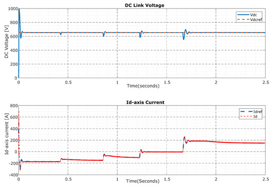 Apart for the determination of the synchronous angle , the PLL illustration on the Figure 4 gives grid voltage and current in the reference frame. The d-axis outer loop controls the DC bus voltage, while the inner loop controls the active AC current [32], as detailed in Figure 3. In case of bi-directional applications, the changes in DC bus voltage are influenced by positive or negative current due to power flow direction. The q-axis outer loop adjusts AC voltage magnitude by regulating the reactive current through the q-axis inner loop control. The decoupling term and the feed-forward voltage signal are added for transient performance improvements. Figure 3 presents the complete control model for the DC link voltage and the grid current. Considering the Equation (1) and the grid voltage level, the DC voltage level of 653.2 V with the rated 432 kW rated power are targeted. Therefore, the DC bus shown in Figure 1 and Figure 2 is of DC.