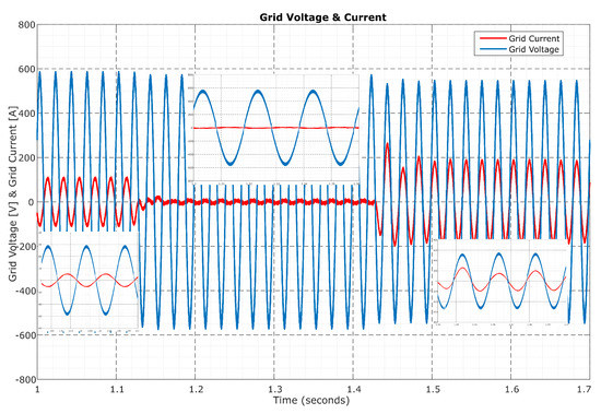 In this situation, the grid behavior is illustrated in Figure 23. The last shows, that in the beginning, the solar power is zero. Hence, the grid is on no-load; it is drawing null current. The power in this case is zero too. When the PV array starts injecting power to the grid, the grid current starts increasing, but in out of phase with respect to the grid voltage. The last is an indicator that the grid is receiving power. Therefore, the grid power is negative as shown in the Figure 24.