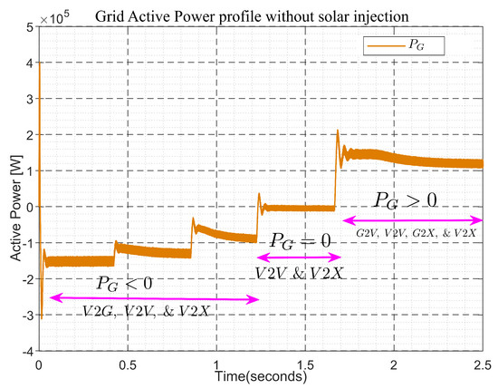 - The stands for a situation when the PV power system is connected to the grid, but not generating power. While the EVs ( are sending power to the grid. The mentioned case is demonstrated on the expression in Equation (10).As the grid is receiving power from the EVs, then this is the V2G scenario. Therefore, the grid active power is negative.