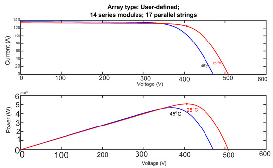 Illustration of PV array power generation with respect to irradiance and weather temperature.