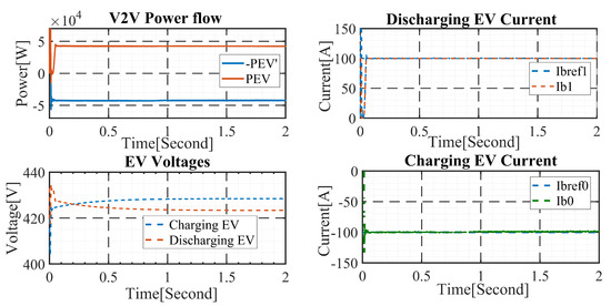 The V2V case is simulated based on the model built in Simulink following the Figure 12 and its results are illustrated in the Figure 26. It considers two EVs mutually interfaced by DC link. One of those is feeding power to the DC link, while another is charging from the DC link. Each EV battery is 400 V and 100 A for each EV. As the charging or discharging current strongly depends on the battery state-of-charge (SOC); the discharging battery SCO is set to 80% (the battery has enough power), and the charging battery SOC is set to 15% (the battery is almost empty).