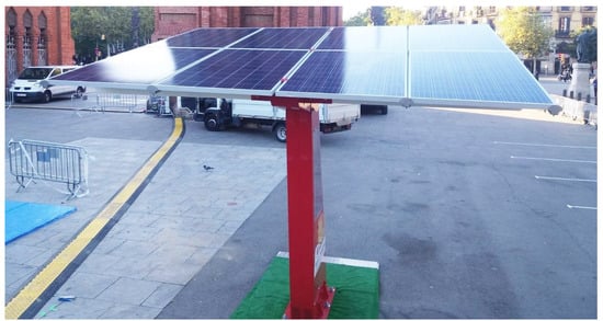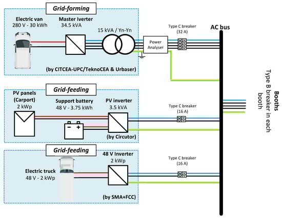 This section presents different results from the live field experience of creating an isolated microgrid in the Expoelectric18 and Expoelectric19 fairs. To illustrate the relevance of these experiences and contextualise their extension, Figure 13 shows the Master Inverter and the main storage system at Expoelectric18. Moreover, for the Expoelectric18 experience, Figure 14 and Figure 15 show the grid-feeders’ participants. Figure 14 shows the electric truck that provided about 2 kWp to the microgrid. The inverter used to interconnect the truck with the microgrid can be observed in Figure 16 as the yellow inverter behind the Master Inverter. Figure 15 shows the PV carport installed for Expoelectric18. Furthermore, Figure 17 and Figure 18 show the grid-feeders used during Expoelectric19. Figure 17 shows the V2G chargers, and Figure 18 the PV installation. Finally, Figure 19 shows a picture of the booths.
