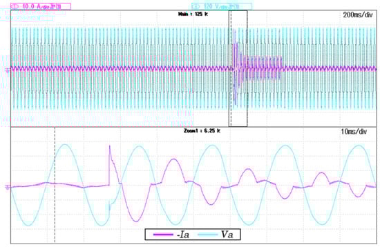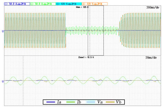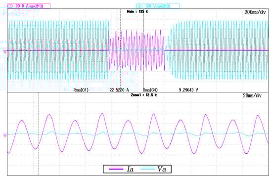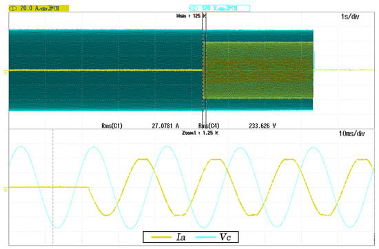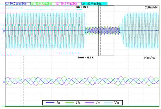 Figure 8, Figure 9 and Figure 10 shows the voltage and current waveform involved in the case of a single-phase short-circuit, two-phase short-circuit, and three-phase short-circuit testing, respectively. The Master Inverter’s phase to neutral voltage and output line currents are indicated as  and , where the subscript x represents each a, b or c lines of the low voltage microgrid. The short-circuit proof algorithm parameters for all these testing captures are K equal to 0.9 and  equal to 22 A. Thus, in Figure 8, Figure 9 and Figure 10 can be validated that the short-circuit poof algorithm reduces the voltage rapidly when the fault occurrence. Moreover, the algorithm allows for recovering the voltage progressively in all situations under the fault clearance situation. Furthermore, the current is maintained almost pure sinusoidal with a low-frequency oscillation. This low-frequency oscillation is an effect of the K factor selected, so the  is affected by it. The higher the K factor is, the more the voltage speed reduction results, but the higher the current oscillation rises.