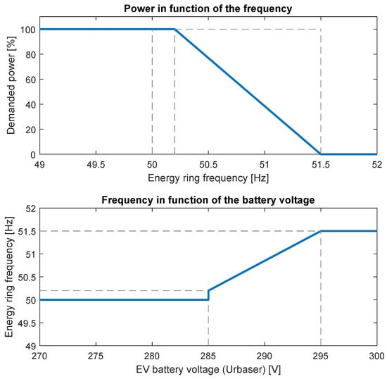 The power to be injected by the grid-feeding inverters is modified by the Master Inverter, as depicted in Figure 5. Furthermore, the Master Inverter modifies the grid frequency according to the battery SoC, as depicted in Figure 5. In this case, the SoC of the battery was unavailable, and the voltage was used as an SoC estimation.