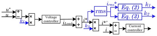 In Figure 7 can be observed how the voltage and current references of the Master Inverter are modified to be adapted for any over-load situation (short-circuit in the extreme case). Both voltage and current references are indicated in Figure 7 using the superscript (). The blue parts are added for the short-circuit proof enhancement concerning a conventional voltage-current nested control loop. The algorithm is based on computing the per phase root mean square (RMS) value of the current reference at the AC side,  to obtain  []. From this RMS value, two other factors are calculated;  and . The first factor, , allows regulating the voltage reference dynamically. Thus, this  factor aims to attenuate the microgrid voltage under short-circuit or high overload situations. The  factor is computed as