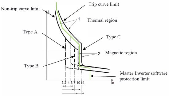 The Master Inverter is power electronic-based. Implying a limited short-circuit power and a waveform of the overload current that may differ from the one provided when the mains participate. Thus, it is not secure enough to trust only the trip curves provided by physical circuit breakers. An extra virtual circuit breaker tripping curve is implemented in the Master Inverter, as shown in Figure 11.