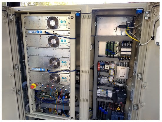 The main element of the microgrid is the Master Inverter. This inverter has been designed and constructed by CITCEA-UPC and teknoCEA. This inverter is the grid-forming inverter responsible for controlling and operating the microgrid. This Master Inverter creates a three-phase plus neutral system (standard in Europe), rated 400 V, 50 Hz with a TT distribution scheme using an isolation transformer. In a TT distribution scheme, the neutral and the exposed conductive parts are earthed. The converter’s typology is a bidirectional three-phase converter with the neutral connected to the mid-point of the DC bus. Thanks to such inverter typology, it can be as flexible as a low-voltage microgrid, where active and passive (uni)bidirectional devices can coexist and be connected arbitrarily to any phase. The Master Inverter is connected to an onboard (electric van) second-life battery pack that provides energy storage to supply the microgrid. The Master Inverter is sized 34.5 kVA, 50 A.