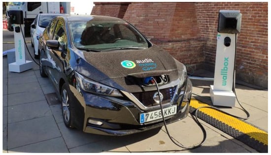 - Expoelectric19 (Figure 2). The main second-life battery for the Master Inverter is of 60 kWh, doubling the capacity of the Expoelectric18 experience. Two V2G chargers constitute the grid feeding devices (by Wallbox) connected to two EVs and a PV installation with battery support (by Audit Energy). The V2G chargers are 3 kVA single-phase bidirectional inverters based on CHAdeMO. Each V2G charger is connected permanently to a 34 kWh Nissan LEAF. The PV installation includes eighteen 315 Wp high-efficiency panels (from JA Solar), a 5 kWp three-phase inverter (by Fronius) and an 11.5 kWh Lithium battery (from ByD). Finally, some loads (lighting, chargers, and power supplies, among others) are connected to the microgrid. The loads are planned to be up to 10 kW per phase.