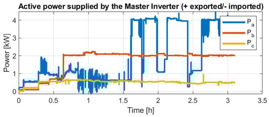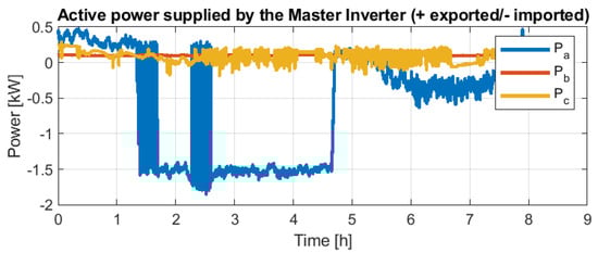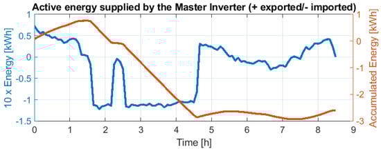 The scheduled loads were maximum of 1.5 kW/phase. Figure 20 shows the Master Inverter’s exchanged energy and total accumulated energy (by integrating exchanged energy). Positive means exported energy (dispatched to the microgrid), while negative corresponds to imported energy (coming from the microgrid thanks to the other active sources). The energy regulation responds to the adaption of VDE-AR-N-4105 [] through the specification previously detailed in Figure 5. This yields the frequency response imposed by the Master Inverter shown in Figure 21. Due to the only metering point, the Master Inverter losses are not considered in the analysis. Thus, even importing energy at the end of the day, as shown in Figure 20, the frequency remains at 50 Hz.