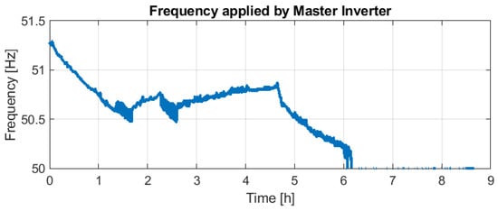- Period 3—Time from 4.5 to 8.5 h(from 14:30 p.m. to 18:30 p.m.). From time 4.5 h on, as the frequency at the beginning of the period is 50.8 Hz, the EV inverter reduces its contribution. The PV system follows a similar pattern compared with Period 2.Due to the reduction of EV inverter contribution, the consumption had to be covered partially by the second-life battery. This derives a frequency drift to 50 Hz, as shown in Figure 21.It should be detailed that even the Master Inverter requests more power at the end of this third period (from time 6 h on); these last two hours correspond to the last afternoon hours. This means low or almost null PV contribution. Moreover, the EV inverter has its logic. Thus, after delivering about 5 kWh during the last time, it did not follow the Master Inverter request, although it delivers some power.