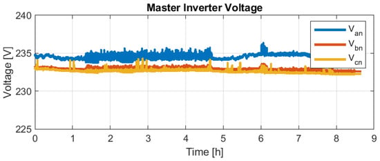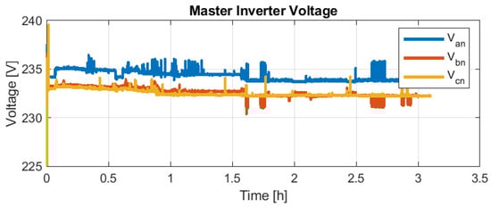 It can be observed in Figure 27 that the Master Inverter starts to request 100% feasible power from the other grid feeders in less than one hour. However, after 3 h, the central storage system was discharged, as no other active sources were available (about 14 kWh provided by the Master Inverter, as observed in Figure 26). Figure 30 and Figure 31 validate again that even in the case of high current THD (5–55%), the voltage provided by the Master Inverter is less than 3%, being better than the admissible 5% mentioned in IEEE-519 [].