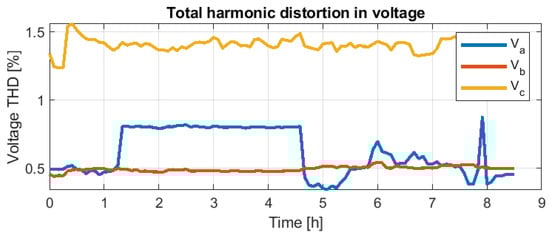 Following the same structure as the previous day for data analysis, Figure 26 and Figure 27 show the energy and frequency followed profile. Figure 28 and Figure 29 show the applied voltages and power supplied to the microgrid. Finally, Figure 30 and Figure 31 depict quality information about the voltage and current THDs.