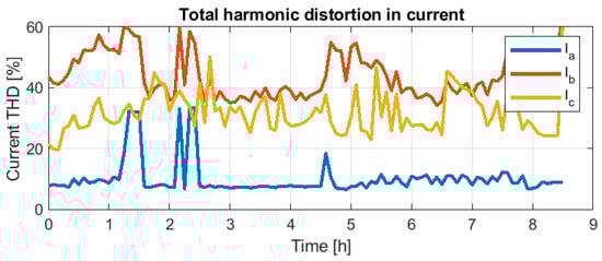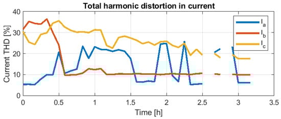 Total harmonic distortion (THD) for the load’s current on 7 October. Missing values from 2.5 h to 3 h are due to missing data from meters.