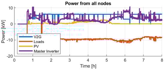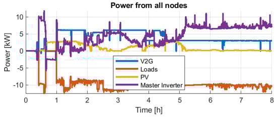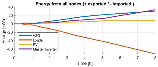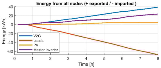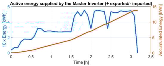 From Figure 32 and Figure 34, it can be observed that in both day experiences, there is an almost constant total consumption of about 10 kW. Furthermore, the PV contributes according to the irradiation availability, and the EV plus the V2G chargers almost always deliver full power. Thus, the Master Inverter delivers the difference. In both days’ experience, the Master Inverter supplied less than 35 kWh and only needed to contribute with a maximum of 10 kW eventually and less than 7 kW continuously.