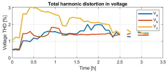 Total harmonic distortion (THD) for the voltages applied by the Master Inverter on 7 October. Missing values from 2.5 h to 3 h are due to missing data from meters.