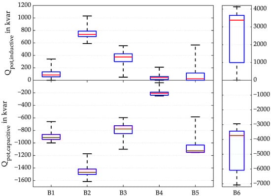 Inductive and capacitive reactive power potential of six measured industrial companies displayed by boxplots (red lines show the medium, blue boxes show the upper and lower quartiles and whiskers show the maximum or minimum of the reactive power potentials). Due to its comparatively high values, B6 is presented separately.