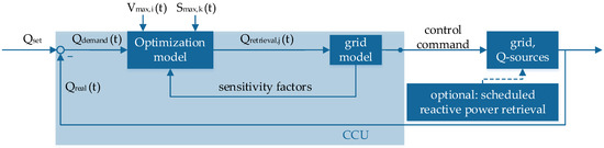 The CCU calculates the reactive power demand of each reactive power source j, based on voltage limitations at each grid node and load flow limitations at each asset by linear programming (LP). At this point, the dependence of the sensitivity factors on the operating point in the load flow calculations must be considered. The load flow calculation can be formulated as a nonlinear problem [39]. The sensitivity factors can be calculated with the Jacobian Matrix, which is formulated by the Newton Raphson power flow equations [40]. With a change of the operating point, the sensitivity factors change in a nonlinear way [41]. For this reason, the calculated will be set in the embedded grid model, which leads to a change of the operating point. The new sensitivity factors are looped back as input data in the optimization model for another iteration (see Figure 5). Thus, more accurate calculations are executed in order to avoid an overestimation of sensitivity factors, and to avoid exceeding voltage or load flow limitations. Following the calculations, the CCU sends control commands to the reactive power manager at the Q-sources (QM) in the grid, which report back their reactive power potential to the CCU as input data for the optimization (see Figure 5 and Figure 6). The ICT to the Q-sources should be very reliable. In case of failure of the ICT, a central control strategy will not work. A backup control strategy must be implemented in the plant controllers that works locally with decentralized scheduled or prediction methods (see [42,43]). In general, DSO must plan for temporary (unexpected) unavailabilities of the Q-sources. It is necessary that they provide enough reactive power capacities locally, which are able to compensate missing reactive power in case of failure of the Q-sources. The transfer speed of the ICT must be within the required retrieval control speed. The calculation time of the CCU and the response time of the Q-sources must also be considered here. The arising after the reactive power retrieval is looped back into the control process for a target/actual comparison according to (7).