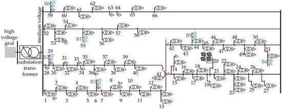 Schematic illustration of the radial topology of the regarded 66-busbar medium-voltage grid with separation points in open position (red) the six implemented industrial companies (blue, B1 to B6) and their reactive power potential (generation units).