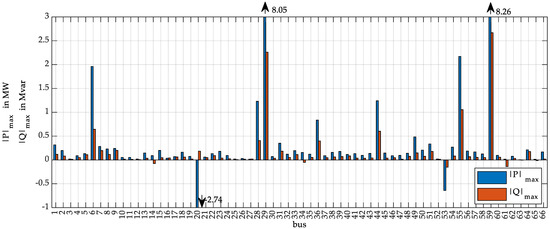 Maxima (absolute) active (blue) and reactive power behavior (orange) at load buses of the medium-voltage test system (non-simultaneous).
