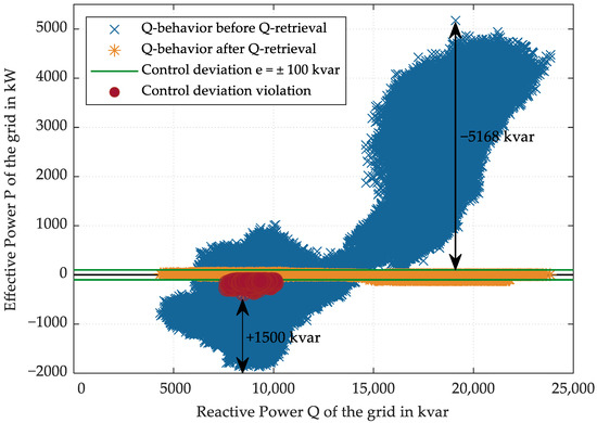 P–Q behavior of the regarded medium-voltage grid (logged at the low-voltage site of the substation transformer) before (blue) and after (orange) the reactive power retrieval by the central reactive power control strategy with red circled data points, which exceed the control deviation (green).