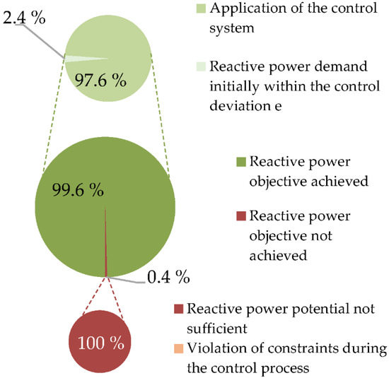 In 99.6% of all grid operating points, a full-compensation in consideration of e can be achieved. In few cases (2.4%), the reactive power behavior of the grid is already within e. The reason for non-achievement in 0.4% of all grid operating points is a non-sufficient potential by the industrial companies (see Figure 11: red areas). A violation of voltage or load flow constraints caused by the control process is not recognizable, which is shown in Figure 11.