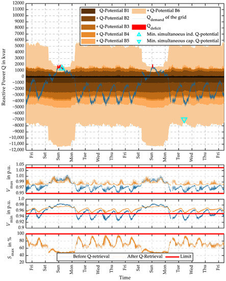 Figure 11 gives an overview of the reactive power potential in comparison to the reactive power demand of the grid and shows the compliance of the voltage and load flow limitations by presenting the maximum and minimum voltage, plus the maximum occurring apparent power capacity in the grid.