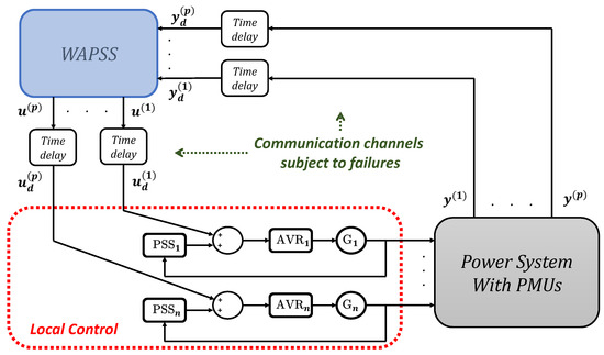 In the field of power system control, Wide-Area Damping Controllers (WADCs) have been developed and consist of using data from remote system PMUs and providing additional control signals to improve the damping rates of the system’s oscillation modes. As the use of remote data allows a greater observability of the system, the WADC is effective in improving the inter-area modes of the system. The first control design proposals adopted a two-level control structure where the first level is PSS design and the second level is WADC design [22]. Thus, the operation of both PSSs and WADC improves both local and inter-area modes of power systems.