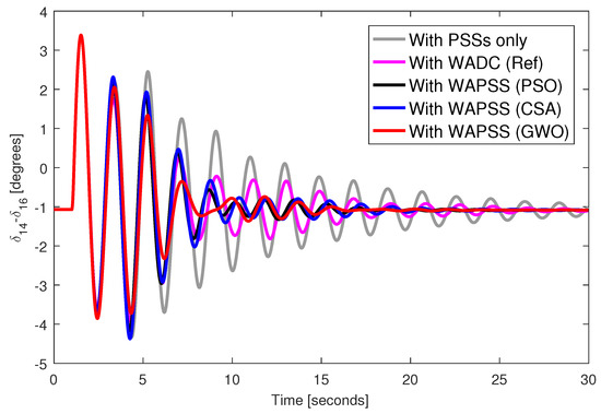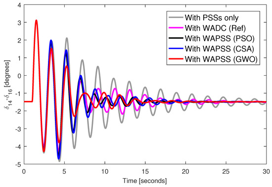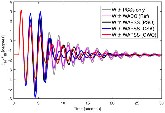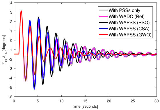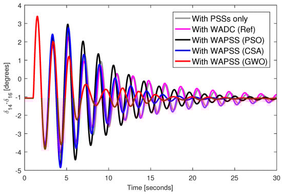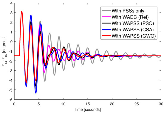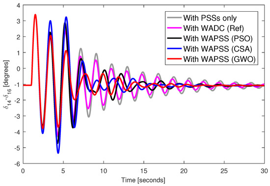 A three-phase fault was applied to bus 40 of the test system during 100 milliseconds with the designed WAPSS controllers. Figure 2, Figure 3, Figure 4 and Figure 5 provide the angular responses of the generator 14 for the base case considering the WAPSS operating without failures, operating with the permanent loss of the speed signal from the generator 14, operating with the permanent loss of the control signal for the AVR 5, operating with the permanent losses of the speed signal from the generator 14 and the control signal for the AVR 5, respectively. Figure 6, Figure 7, Figure 8 and Figure 9 provide the angular responses of the generator 14 for the base case with disconnection of the transmission line 33–54 considering the WAPSS operating without failures, operating with the permanent loss of the speed signal from the generator 14, operating with the permanent loss of the control signal for the AVR 5, operating with the permanent losses of the speed signal from the generator 14 and the control signal for the AVR 5, respectively. It is observed that angular responses are well-damped with the presence of WAPSS. The WAPSS designed by the GWO metaheuristic performs slightly better than other WAPSSs in terms of angular response. The angular responses are well-damped, even when one or two communication failures occur in the test system. However, the WADC controller (WADC (Ref)) designed by the [55] method performed satisfactorily only when the WADC controller operates with even one communication failure. When two communication failures occurred, the angular responses were poorly damped for the system with the WADC controller (WADC (Ref)).