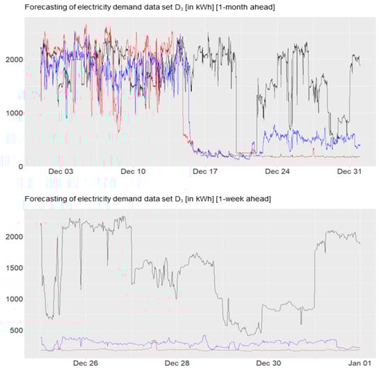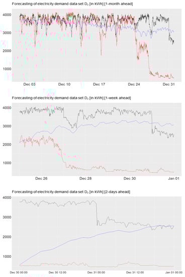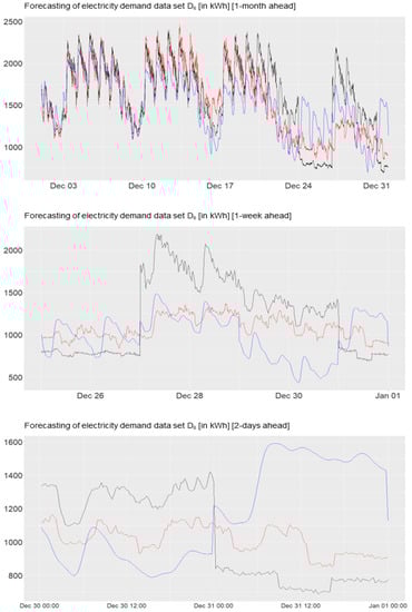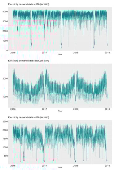 As mentioned before, the energy demand data are provided by a local electricity supplier, and, for the sake of simplicity and confidentiality, we will use an anonymous way of abbreviation for the eight data sets displayed in Figure 1 and Figure A1 (see Appendix A for further time series data of electricity consumption), e.g., “”, “”, “”, “”, “”, “”, “”, and “”. These represent high frequency data sets (96 data points per day represented in kWh) with potentially multiple seasonalities and a weak trend component that usually contain three years worth of observations starting from 2016. In general, the customers’ consumption behaviors are quite heterogeneous. For example, the top diagram in Figure 1 shows the demand for data “” which significantly decreases at the beginning of every quarter. In the last diagram of Figure 1, the consumption of “” displays sharp decreases during the given years. The electricity demand for data “” decreases smoothly in the middle of the years, which means that the consumption is high in January and decreases until approximately the ninth month with an increase thereafter.