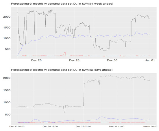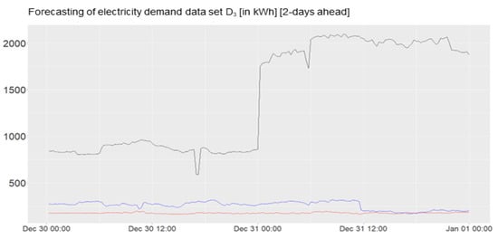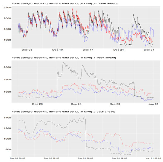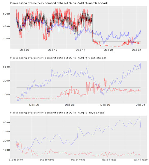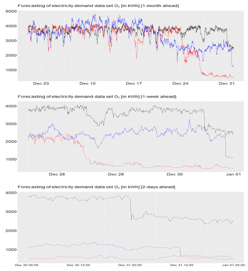 Forecastings 2 days ahead of the data sets “”, “”,“”, “”. Red: Actual Demand. Black: local electricity supplier. Blue: Dynamic Harmonic Regression.