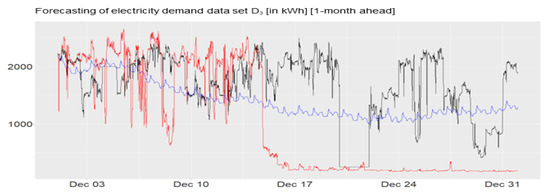 Forecastings one-month ahead of Dynamic Harmonic Regression and the local electricity supplier for the data set “”, “”, “”, “”. Red: Actual Demand. Black: local electricity supplier. Blue: Dynamic Harmonic Regression.