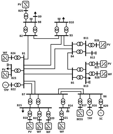 - Operating scenario 1: the network operates with one SM, with a load consumption of 60 MW, a wind generation of 40 MW and a PV generation of 10 MW;