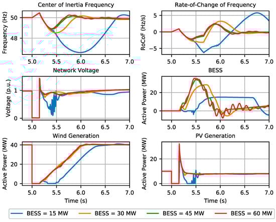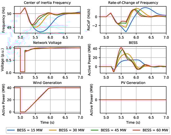 The results can be observed in Figure 3 and Figure 4, regarding operating scenario 1 and operating scenario 2, respectively. It was verified that a 60 MW BESS power capacity is required in order to contain the system frequency within the prescribed limits (49.4 Hz and −2 Hz/s) in operating scenario 1, corresponding to a power capacity much larger than that of the synchronous units. On the other hand, even with a 60 MW BESS, the frequency nadir reached approximately 49.25 Hz in operating scenario 2, exceeding the minimum frequency limit. As observed, the large frequency deviation following the fault clearance was induced by the wind generation recovery ramp, which took about 1 s to recover to their pre-fault active power injection. It was also observed that a higher BESS power capacity translates into higher amounts of power injected into the grid by the BESS after the fault clearance. In scenario 1, for the case of a 15 MW BESS, some voltage oscillations after the fault clearance were observed, which led to PV active power oscillations. Moreover, the results clearly demonstrated that RoCoF sensitivity to the BESS power capacity, in the range where load shedding is avoided (RoCoF > −2Hz/s), was effective only if very large (>45 MW) BESS capacities were used.