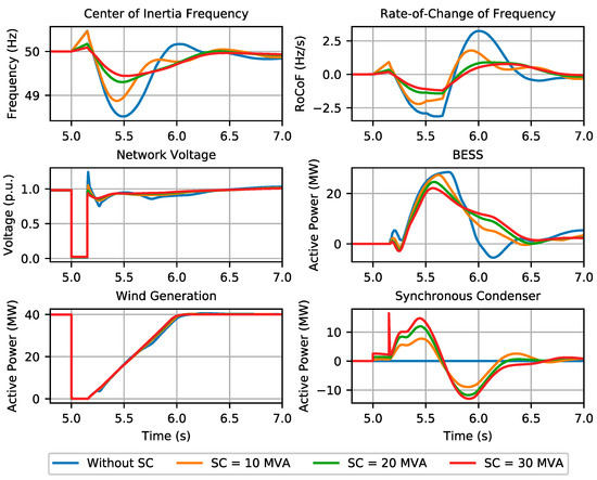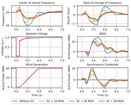 In this section, we evaluate the impact of adopting SCs into the grid frequency dynamic behavior. In this case, the BESS power capacity was fixed at 30 MW, while four distinct cases were compared, representing different levels of SC integration, namely 0, 10, 20 and 30 MVA (note that an inertia constant of 7 MWs/MVA was considered for the SC).