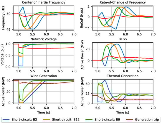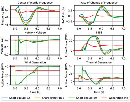 In the literature, authors commonly consider the loss of the largest generating unit as the critical disturbance in isolated or low inertia systems [,]. In line with the previous sensitivity analysis, in order to identify what type of contingency event has a higher risk of endangering system frequency stability, an analysis was performed, with the same network scenario (installation of a 30 MW BESS without the inclusion of an SC). Thus, the sudden loss of a generating unit and short-circuit events in different locations of the network were simulated, both in transmission and distribution networks. Regarding the generation trip event of the generating unit injecting the largest amount of active power was considered. In operating scenario 1 this event corresponds to a generation trip of 9.4 MW, while in operating scenario 2 it corresponds to the tripping of 11.1 MW in the Soroni diesel unit 1.