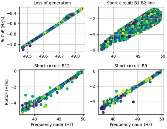 As observed in Figure 9, for generation tripping events, there was no risk of violating frequency nadir or RoCoF limits for all the considered scenarios, since the BESS regulation action was able to keep the frequency values within the prescribed metrics. On the other hand, it was possible to conclude that for short-circuit type events, a large share of insecure operating scenarios was identified, ranging from 29.7% to 40.7%, depending on the short-circuit location, causing frequency and/or RoCoF violations.