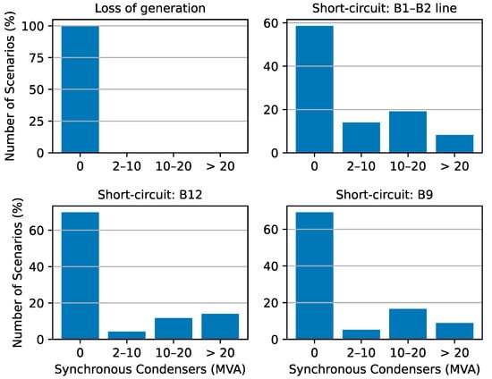 Thus, for the insecure operating points, the dynamic simulations for accessing the key frequency indicators were iteratively repeated through a successive increase of the SC installed capacity in steps of 2 MVA (with an inertia constant of 7 MWs/MVA per installed capacity []). This step was used in order to provide a wide granularity of the data set with respect to the influence of the SC capacity on the key frequency indicators under assessment. Hence, the distribution of the volume of the SC which was required to be installed for each contingency event is shown in Figure 10. As it can be observed for short-circuit type disturbances, in 30–40% of the considered scenarios required to schedule a SC to assure system dynamic security. Nevertheless, different trends in the distribution of the required capacity of additional SC depend significantly on the fault location.