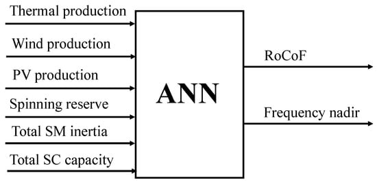 In this section we present a methodology which aims to quantify, for a given network operating scenario, the required minimum synchronous inertia which is able to sustain the frequency deviation and admissible RoCoF to its prescribed limits, considering a set of distinct disturbances. Hence, the ultimate goal is to secure the grid frequency dynamics in the face of critical disturbances without risking load shedding activation. As demonstrated in Section 3.3, network faults are the critical network contingency event, requiring the dynamic simulation of a complete network model, which is computationally demanding. In addition, from Section 3.3 it was verified that it is recommended to consider multiple contingency events to monitor the network dynamic security, which increases the computational burden associated with the dynamic simulations required to characterize key frequency indicators for each operating scenario. Therefore, it was necessary to exploit a machine learning-based approach, based on offline-generated system knowledge, in order to avoid the execution of dynamic simulations. Thus, an ANN-based framework was developed for the fast assessment of the network frequency key indicators (nadir and RoCoF). The ANN training was performed offline through a knowledge database which contains information about a large set of feasible network operating scenarios. Afterwards, the minimum amount of SC that should be connected to the system was computed based on a sensitivity analysis between the ANN outputs (frequency nadir and RoCoF) with respect to the input defining the SC’s total capacity.