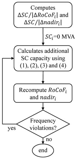 where is the additional capacity of SC that should be added to the system in each iteration of the process (considering contingency event ), while is the total determined SC capacity. and are the respective outputs of the considered ANN, while and are the coefficients that translate the sensitivity between the ANN input defining the SC total capacity and the ANN’s RoCoF and frequency nadir outputs, respectively. At the end of each iteration, the ANN’s and are recalculated, considering the updated capacity. The flowchart of this preventive control algorithm is presented in Figure 12.