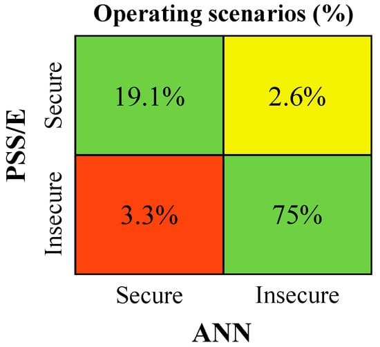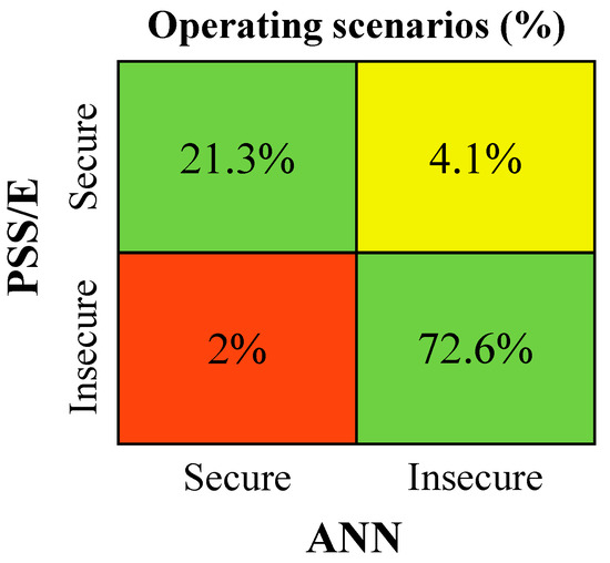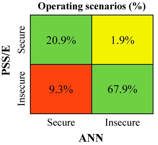 Figure 13, Figure 14 and Figure 15 show the analysis with respect to the operating scenarios’ dynamic security classification. The green squares represent operating scenarios which were correctly classified by the ANN, representing 88.8–94.1% of the considered scenarios, depending on the disturbance event. In contrast, the yellow and red squares represent operating scenarios with prediction errors, which resulted in a wrong classification. However, the yellow squares represent scenarios which were classified as secure according to the PSS/E results and insecure by the ANN predictions. Despite the ANN prediction error, such cases will not jeopardize the dynamic stability of the system during its operation, in contrast to the red squares, which consists of false negative results. In such cases, the network is susceptible to dynamic security instability during its operation. In Figure 13, a considerable percentage of false negative predictions by the ANN was observed (9.3%). However, this security classification error does not necessarily reflect large errors in the ANN capability for inferring key frequency metrics for each scenario. For this particular case, the PSS/E dynamic simulation results of many scenarios were very close to the security boundaries (49.4 Hz and −2 Hz/s). In such cases, even a small ANN prediction error led directly to a wrong ANN dynamic security classification.