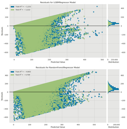 Of the analysed models, LightGBM and RF are consequently chosen as models for further analysis. Since PyCaret does not perform a parameter optimization, this was subsequently carried out. For RF, parameters were chosen manually to ensure accuracy while avoiding overfitting as follows: criterion = ‘mse’, max_features = ‘auto’, min_samples_leaf = 8, min_samples_split = 5. All other parameters were left in the default settings of sklearn. For the LightGBM, a grid-search for hyperparameter tuning was performed for the key parameters num_leaves, max_depth, and learning_rate. The resulting values were learning_rate = 0.1, max_depth = 60, and num_leaves = 120. All other parameters were again left as default.