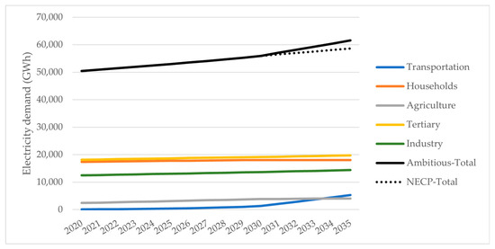 Annual final electricity demand considered for the ambitious scenario (per sector and in total) and National Energy and Climate Plan (NECP) scenario (in total) over the 2020–2035 period.