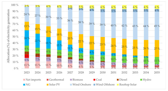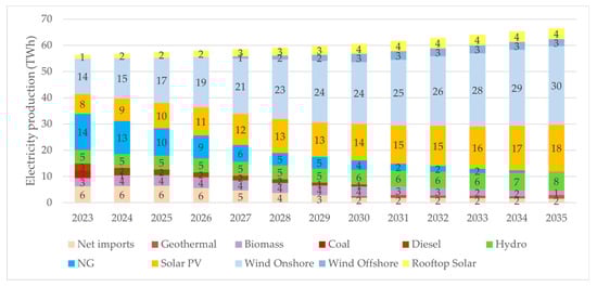 Allocation of annual electricity production across the system’s types of power technologies over the 2023–2035 period, for the ambitious scenario.