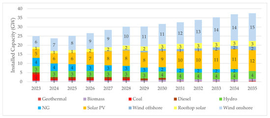 Similarly, Figure 5 displays the annual installed capacity of each type of power technology in the system from 2023 to 2035 for the ambitious scenario. From this figure, it becomes evident once again that the decarbonization of the Greek power sector, coupled with the electrification of the economy, is closely tied to the capacity expansion of onshore wind and commercial PV technologies. By 2030, the total installed capacity of the power sector can exceed 30 GW, ultimately reaching almost 35 GW by 2035. The slight decrease in the total installed capacity observed in 2024 can be attributed to the phasing-out of most lignite power plants, except for “Ptolemaida V”. The latter power plant joined the system in 2023, with a capacity of 0.7 GW, and is planned to cease operations in 2028. Hence, it can be inferred that the transition to a highly renewable power system is associated with a larger power sector.