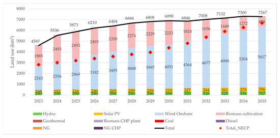 This trajectory of the power sector can increase land competition, primarily due to the substantial land areas required for the placement of wind and solar technologies’ infrastructures. Figure 6 provides an approximation of the annual land use each system power generator would require during the 2023–2035 period for the ambitious scenario, as well as the potential total annual land requirements for the NECP scenario.