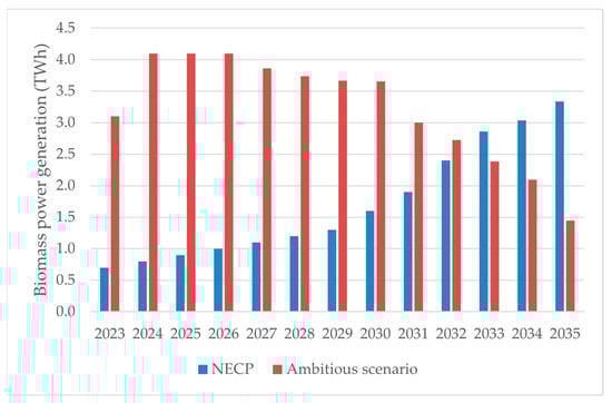 It also gives an estimate of the annual land use which would be needed for biomass cultivation. As shown, onshore wind infrastructure is expected to be the main contributor to the increased land use competition, accounting for around 77% of the total land use for power generation operations in 2035. While the difference in land use for power generation between the NECP and ambitious scenarios could reach a peak as high as 84% in 2024, it is expected to decrease over time, reaching as low as 9% by 2035. This trend is attributed to the gradual decline of biomass power generation and the associated land needs for biomass cultivation under the rapid decarbonization scenario. In contrast, the NECP scenario exhibits the opposite trend, resulting in higher biomass power generation than the ambitious scenario by 2033. This course is illustrated in Figure 7, which shows the annual biomass power generation in the NECP and ambitious scenarios. In the ambitious scenario, more non-conventional renewable technologies are inserted into the system over time, thereby reducing the reliance of the system on biomass power generation. However, there is a lag in the process of building the required renewable energy capacity to facilitate the reduction in biomass power generation.