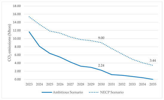 Moreover, the rapid decarbonization pathway of the power sector can result in significant CO2 emission reductions. Figure 8 demonstrates the estimated CO2 emissions of the power sector for both the ambitious and NECP scenarios over the 2023–2035 period. Under the ambitious scenario, the target of attaining 100% renewable power generation by 2035 leads to zero CO2 emissions for power generation by then. It is worth mentioning that in this case, the reduction in CO2 emissions is front-loaded and will be significantly curbed by 2030 (>75% reduction compared to NECP in 2030). This trend signifies the environmental rationale of expeditiously investing in clean technologies. However, in the real world, numerous barriers may impede this endeavour, such as electricity network saturation and delays in legal permitting processes for renewable energy projects, rendering this ambitious endeavour challenging, if not unattainable [58,59].