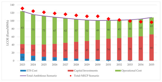 While transitioning to 100% renewable power generation requires substantial investments in clean energy technologies, the implications differ for the system’s operational costs. In particular, the variable cost of the system significantly decreases under the ambitious scenario. This can be attributed to the lower utilization of fossil fuels, mainly fossil gas, which subsequently leads to reduced Emissions Trading Scheme (ETS) costs. Consequently, the rapid decarbonization of the power sector can have a positive impact on power generation costs. This can be observed in Figure 10, which depicts the annual levelized cost of electricity (LCOE) per megawatt-hour (MWh) of the final electricity demand for both the ambitious and NECP scenarios. For the ambitious scenario, the LCOE is depicted per cost component, including capital investments, fixed and variable operational costs, and ETS costs, while for the NECP scenario, the total annual LCOE is provided.